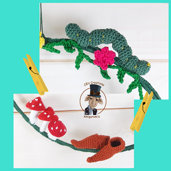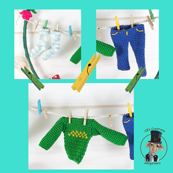 Amigurumi Haakpatroon van kleren van een kabouter aan een waslijn om de mooiste verhalen te vertellen. Inclusief paddenstoelen, rupsje en muisjes.