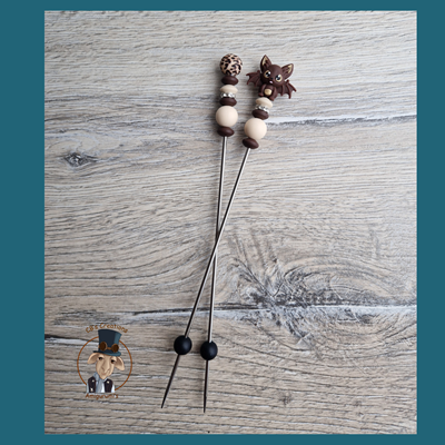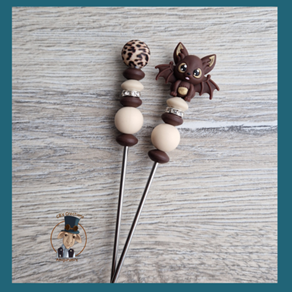 De amigurumi sticks zijn niet alleen handig maar zien er ook nog eens leuk uit. Deze set van 2 ami sticks zijn voorzien van een grappige vleermuis en een mooie kraal met een dierenprintje als focal bead. De vleermuis helpt je graag om jouw Halloween projecten in elkaar te zetten. De vleermuis is omringd door siliconen kralen in warme bruintinten met daartussen een leuk glimmertje!