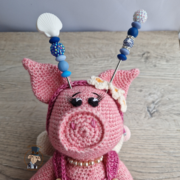De meeste kralen zijn siliconen kralen, een enkeling is van acryl. De naalden zijn maat 2.5 en de totale amigurumi stick is 24-25cm lang.