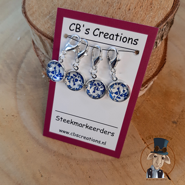 Dit is een setje van 4 mooie Delfts blauwachtige steekmarkeerders met een zilverkleurige (zinklegering) als achterkant en een glazen (cabuchon) voorkant.