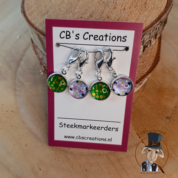 Dit is een setje van 4 leuke steekmarkeerders met een zilverkleurige (zinklegering) als achterkant en een glazen (cabuchon) voorkant.
