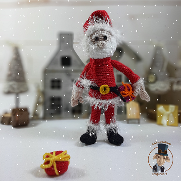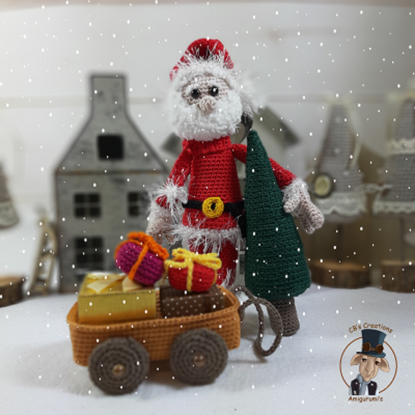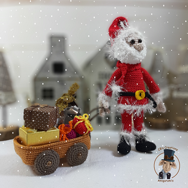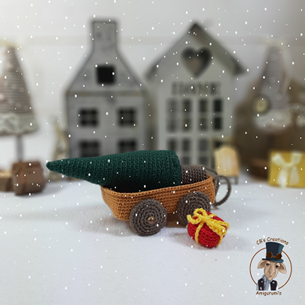 Amigurumi haakpatroon van een helper van de Kerstman met een kar, kerstboom en cadeautjes
