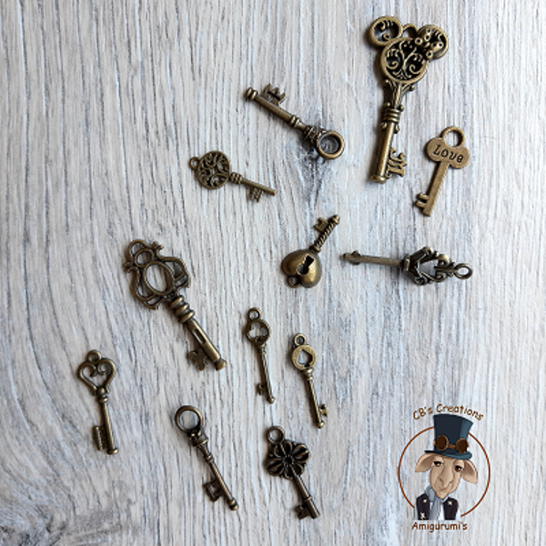 De sleutels zijn allemaal bronskleurig en gemaakt van een zinklegering. De prijs is per stuk of per setje.