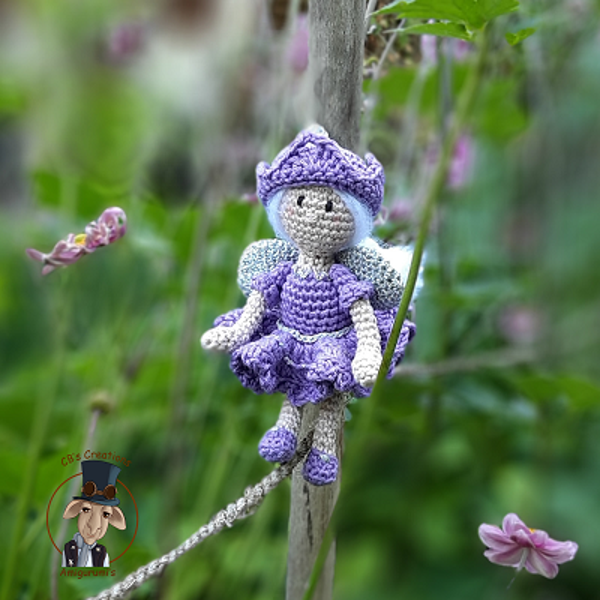 Zittend klein Elfje dat kan schommelen. Aanvulling op het amigurumi haakpatroon van Joy, het kleine Elfje uit het fototoestel van Franklin Forge