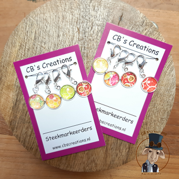 Deze speciale cabuchon steekmarkeerders bestaan uit vele soorten citrusvruchten, zoals citroen, sinaasappel, limoen, grapefruit en bloedsinasappel. Elk setje bestaat uit 4 verschillende overheerlijke stukjes fruit! Zo krijgt jouw haakwerk ook heel veel vitamientjes binnen!