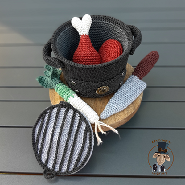 Amigurumi haakpatroon BBQ met allerlei vlees en groente, spatel en mes